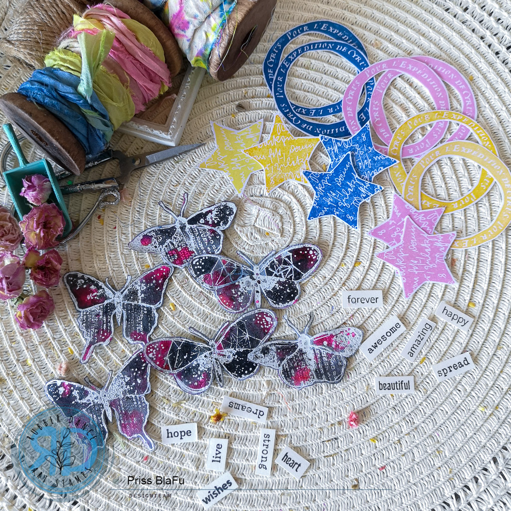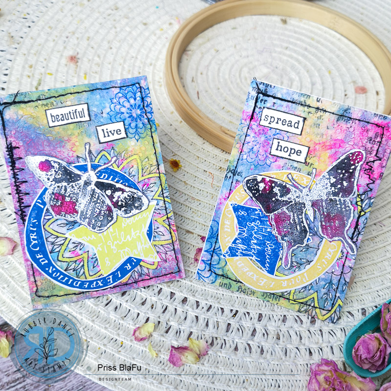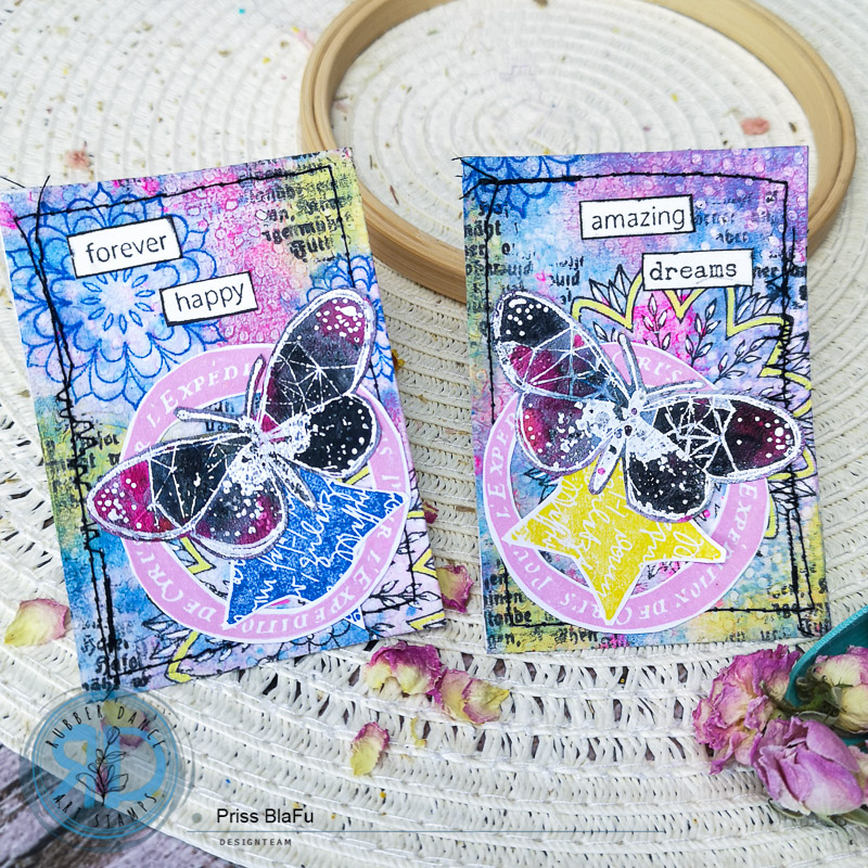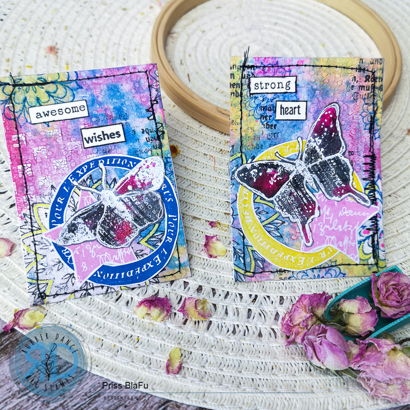 Utilicé las exquisitas mariposas del set Grungy Butterflies como protagonistas, estampadas en una página de libro con polvo de embossing blanco y luego pintadas con las fantásticas Magicals de Lindy’s Gang, en color Midnight Rendevouz, espolveradas y activadas con agua. Para completar los ATC artísticos, estampé textos del set Mix a Sentiment 1 , agregando mensajes significativos a cada una de mis ATCs.