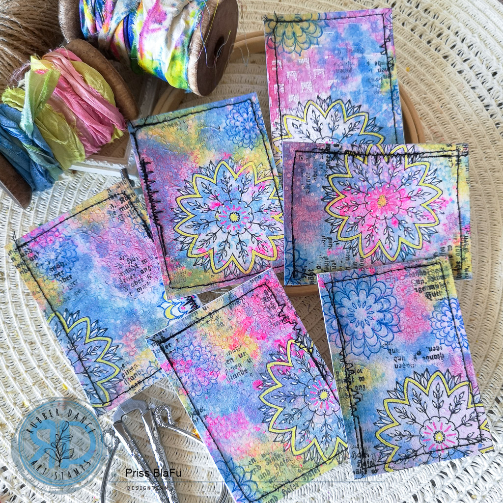Luego introduje los preciosos sellos de Mándalas, estampando el más grande con tinta permanente negra y el más pequeño con una tinta azul distress oxide. La adición de letras negras aleatoriamente mejoró aún más el diseño. También añadí una capa extra con una plantilla de fondos y la misma tinta azul de los mándalas.