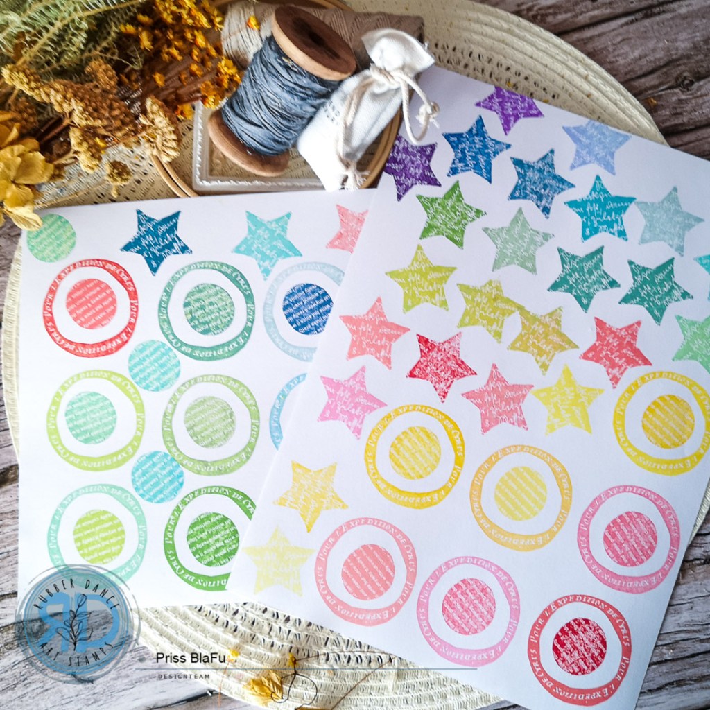 Después preparé varios elementos para la composición final, incluidos círculos y estrellas del set de sellos Grungy Stuff de Rubber Dance. Estos elementos se estamparon con tintas Distress Oxide azul, amarilla y rosa, lo que proporciona el acompañamiento perfecto para los puntos focales de cada ATC.