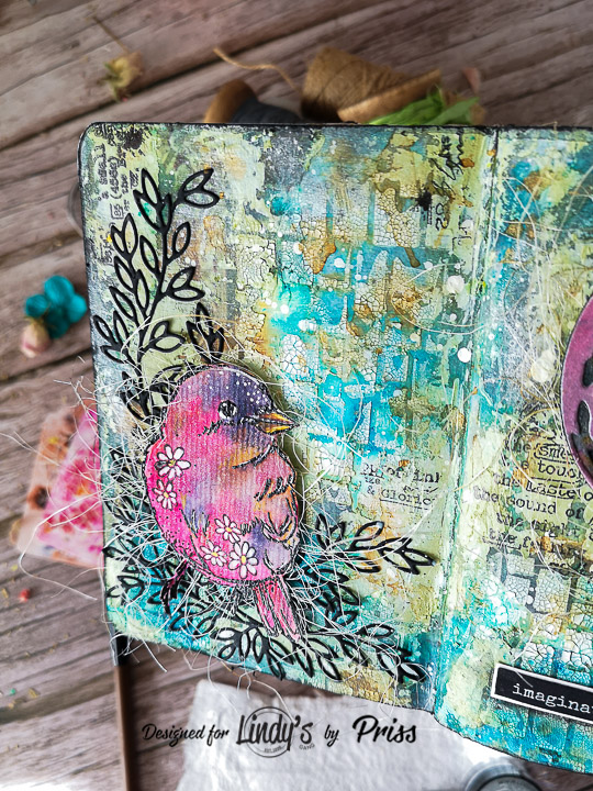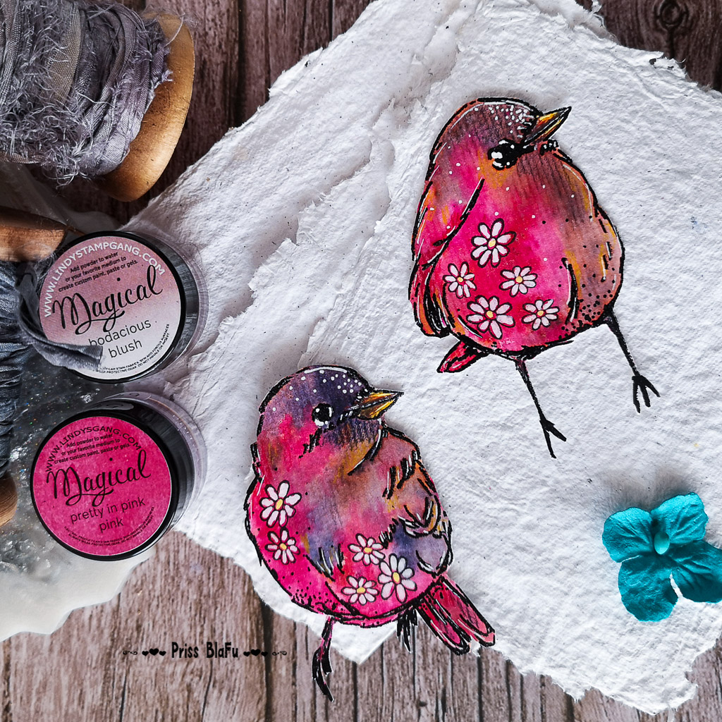 Ahora es el momento de infundir a nuestro amigo emplumado una explosión de color. Yo usé los mágicos Bodacious Blush y Pretty in Pink Pink (ambos del set Totally 80’s) sobre la imagen del pájaro en relieve con la misma técnica que en el paso 3. A medida que los magicals entren en contacto con la superficie húmeda, fluirán y se mezclarán, creando tonos que simulará las variaciones del plumaje.