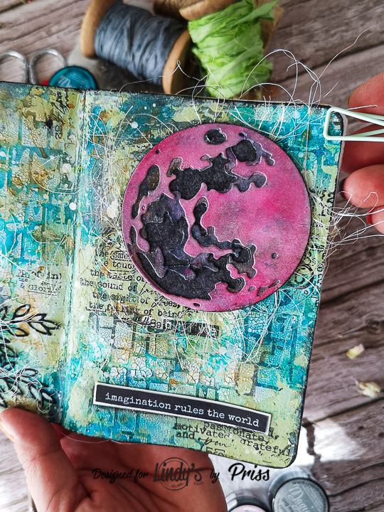 En este paso final, trabajaremos con la composición, juntando los puntos focales de la luna y el pájaro. Además, incorporaremos algunas ramas troqueladas en cartulina negra, delicadas hebras de sisal y un sentimiento que captura la esencia de nuestro viaje artístico: «La imaginación gobierna el mundo».