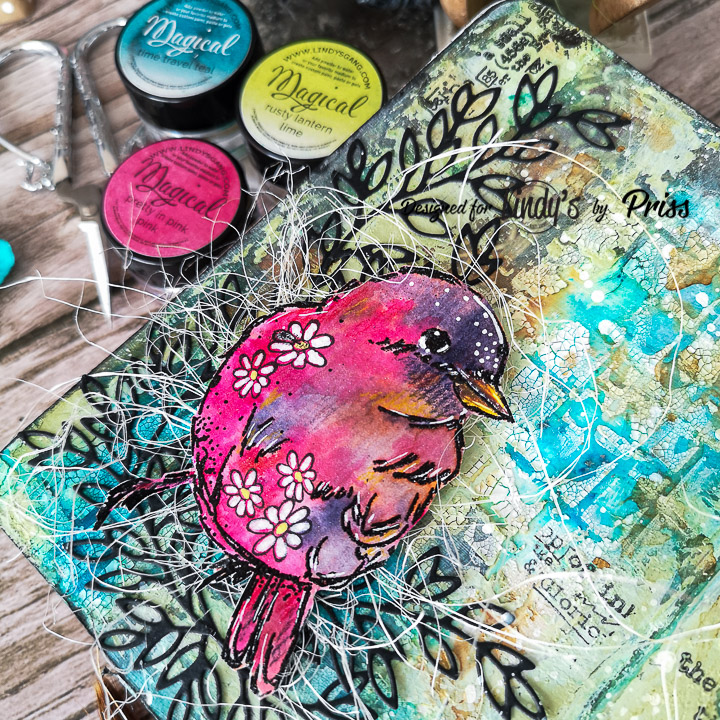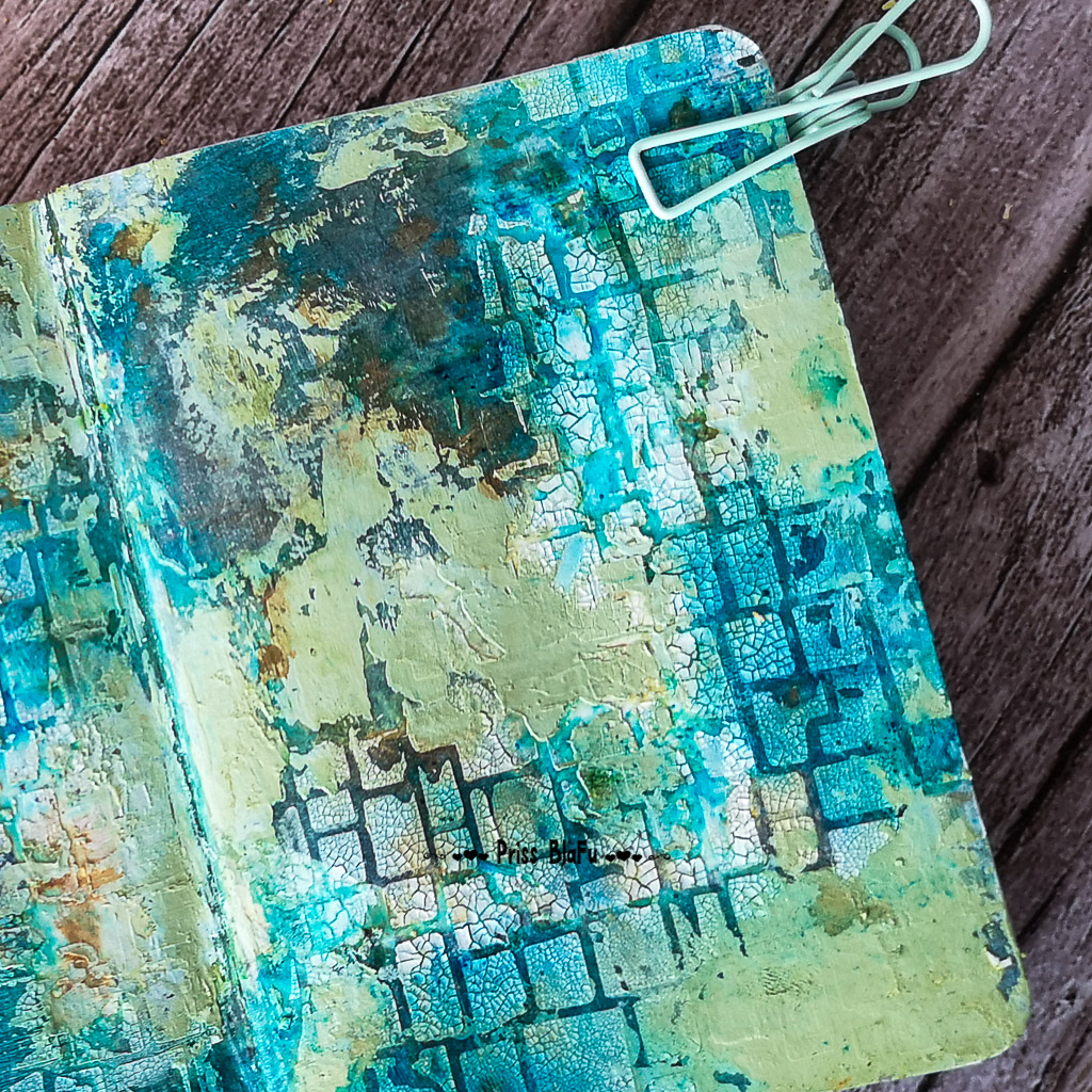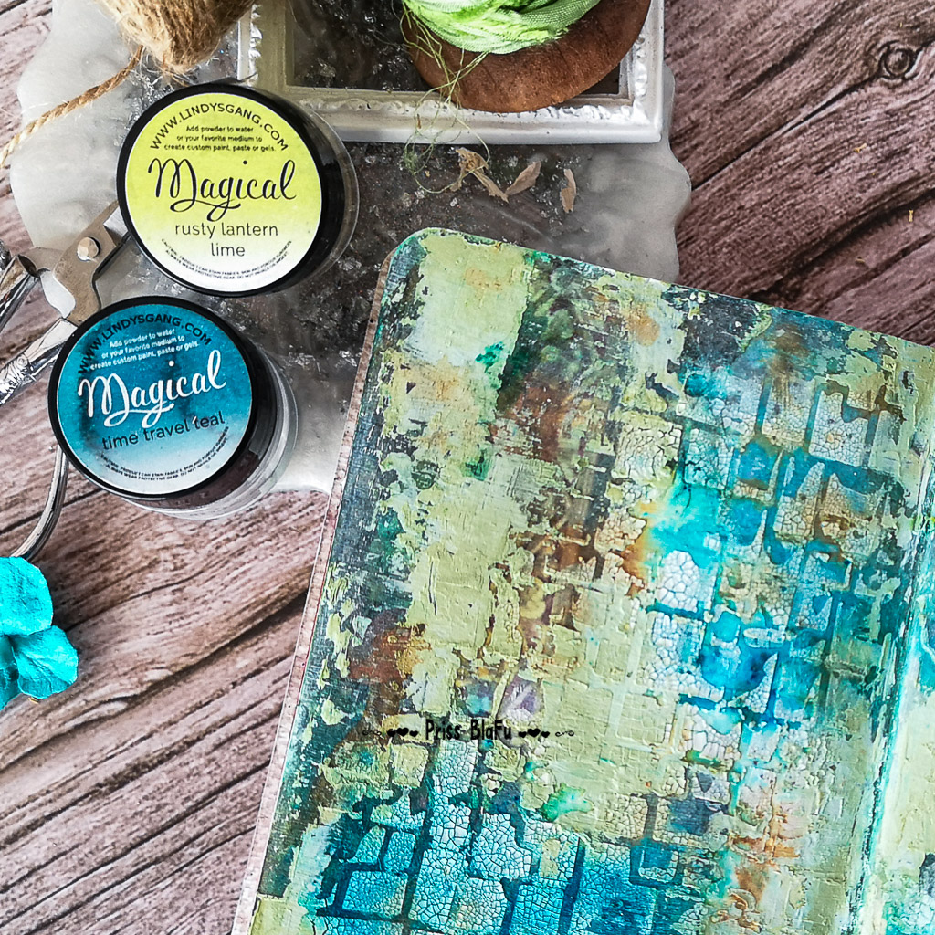 Pero eso no es todo. También añadiremos divertidas capas de textura a nuestro fondo, utilizando pasta de textura coloreada con los pigmentos de Lindy’s, pasta de craquelado blanca y stencils para lograr un efecto único y dinámico. Me acompañas?