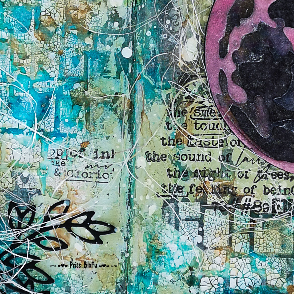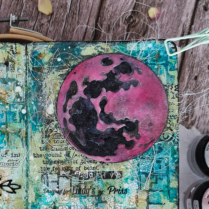 Cuando esto sucede necesitamos integrar los elementos y para lograrlo apliqué una fina veladura en la capa superior de la luna con el mismo tono rosa intenso que el pájaro. Con esta delicada capa de esmalte, creamos una impresionante luna de sangre, añadiendo a nuestra página un encanto de otro mundo.