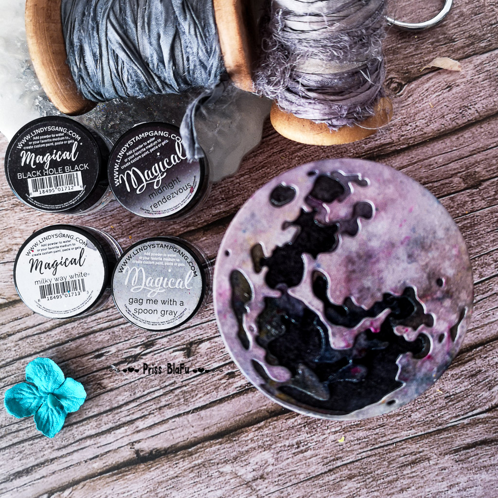 Ahora, volvamonos un poco lunáticos mientras creamos una luna usando el troquelado en capas diseñado por Nuneka para Funky Fosil. Este troquel consta de tres capas que pintaremos por supuesto usando Lindy’s (recuerda rociar una suave neblina de agua sobre el troquel para que los pigmentos se adhieran suavemente), comenzando desde el tono más oscuro hasta el más claro: