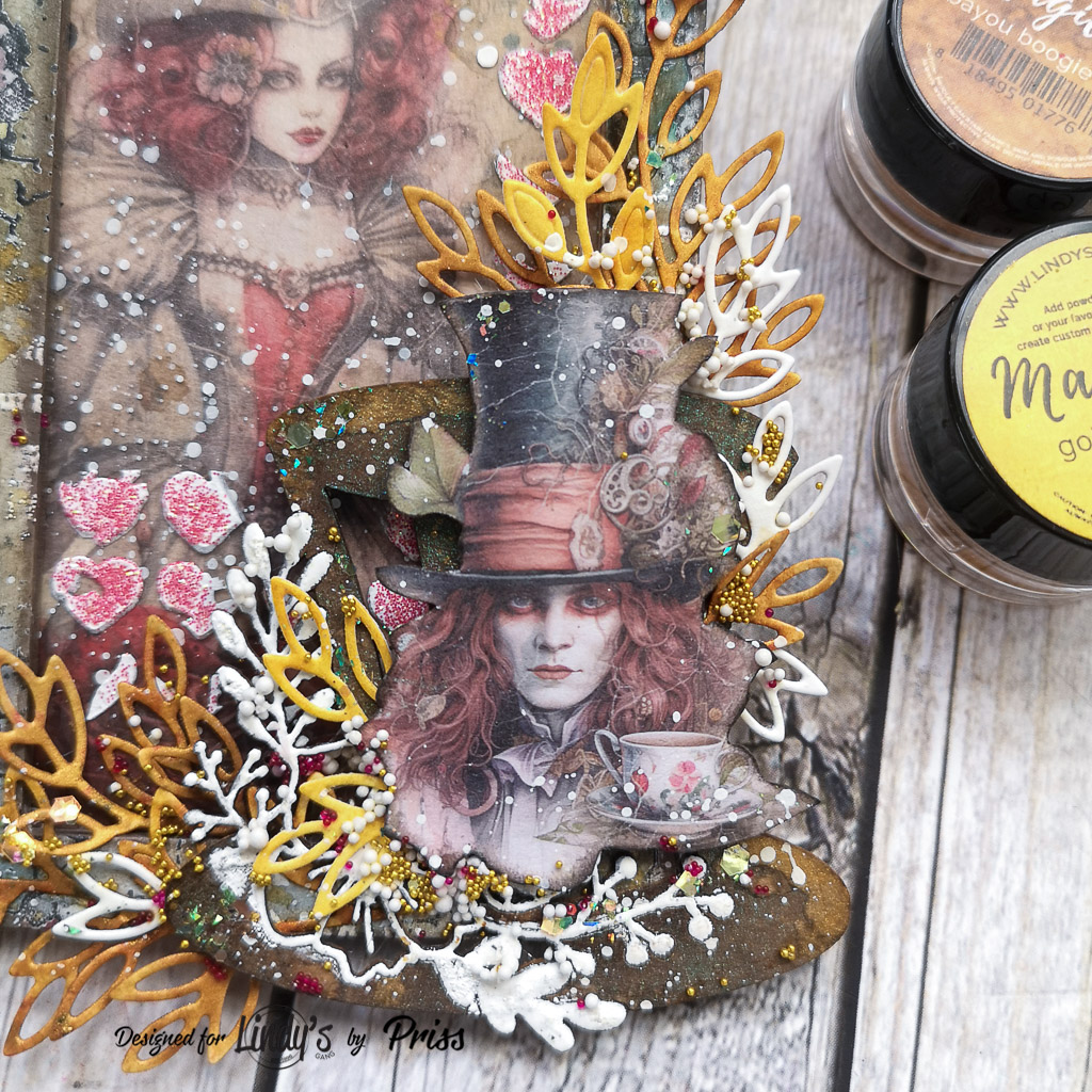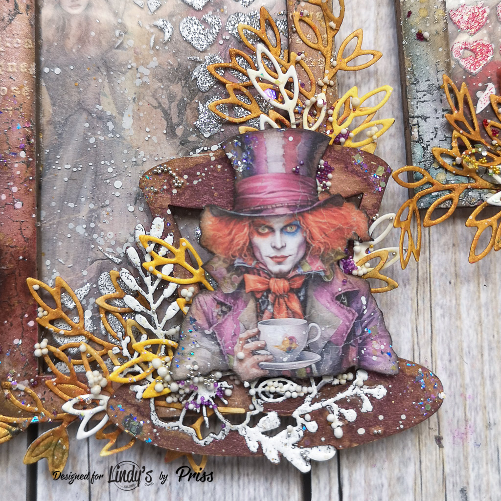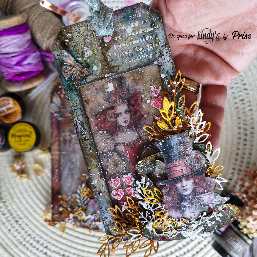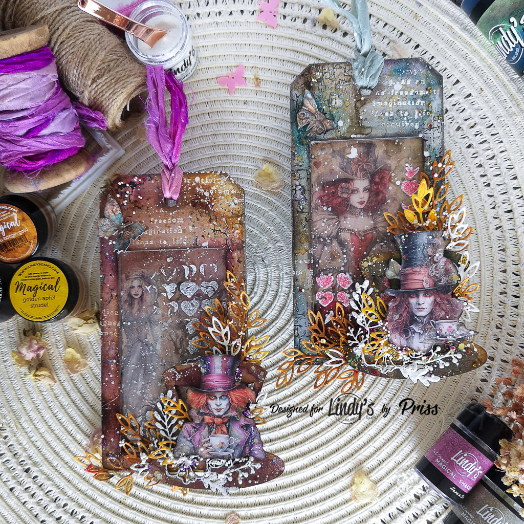 El diseño de estos tags está inspirado en el Sombrerero Loco de Alicia en el País de las Maravillas. Ambos tienen al Sombrerero Loco como punto focal, pero un tag representa a la reina roja y el otro a la reina blanca. ¿Cuál es tu favorita? Personalmente, me fascina el personaje de la Reina Roja, y en este caso, su ilustración me parece maravillosa.