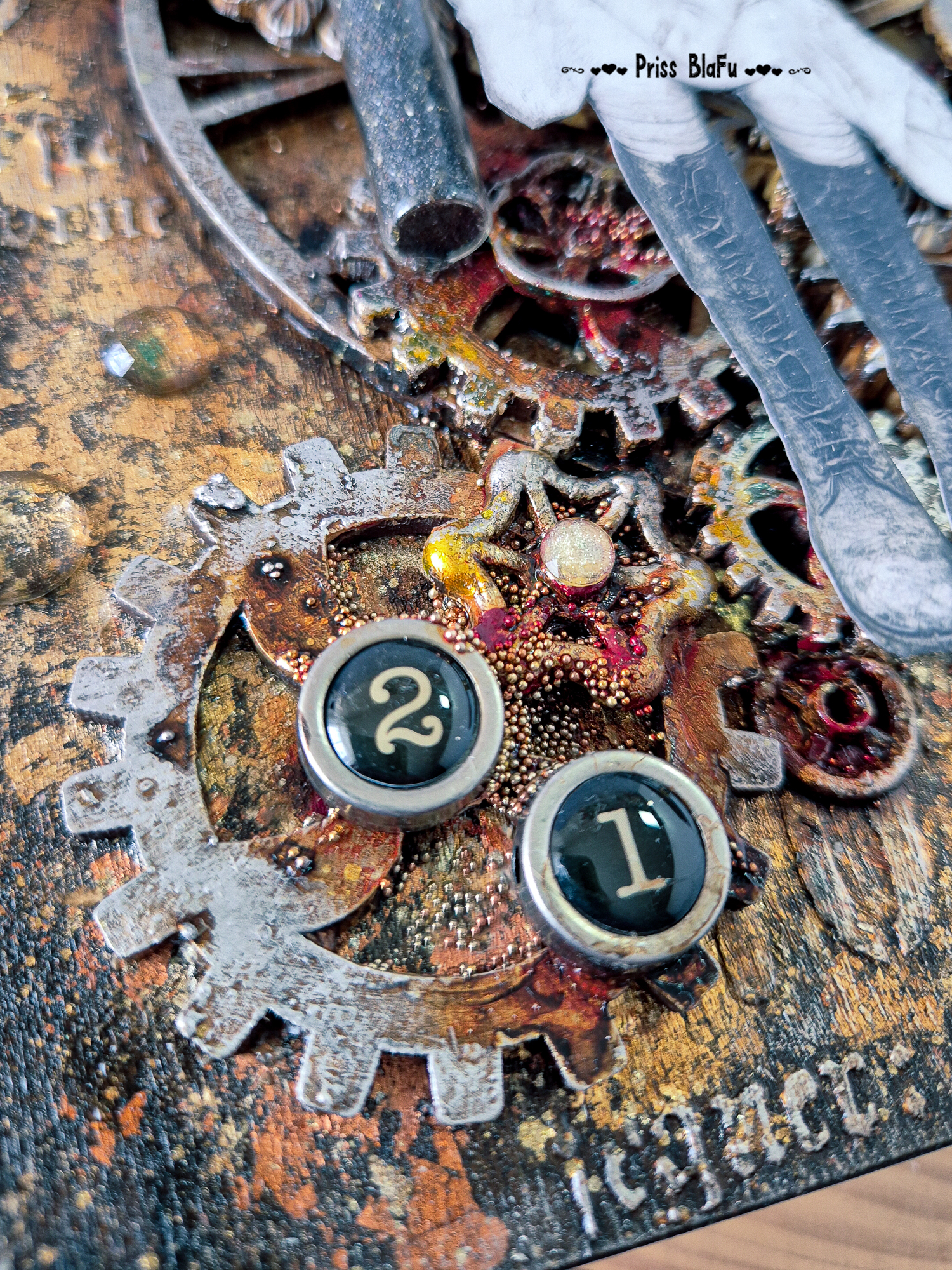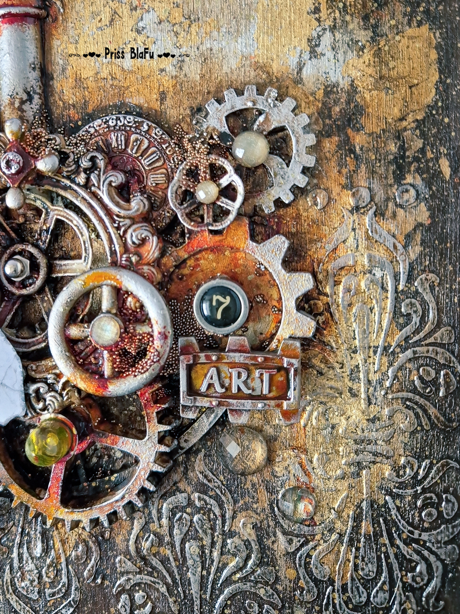 Usé pigmentos, oxidos, engranajes y su color favorito para representar su espíritu y el vínculo invisible que aún siento con ella.