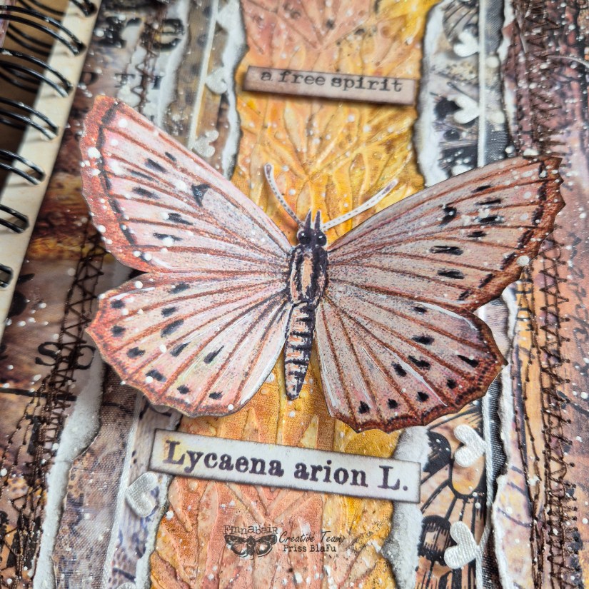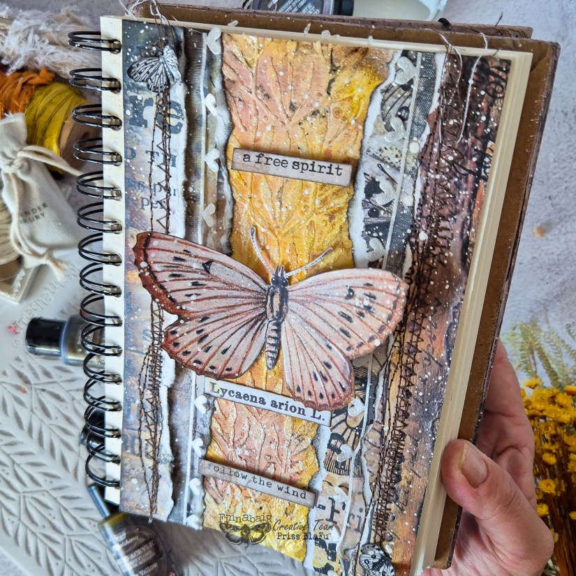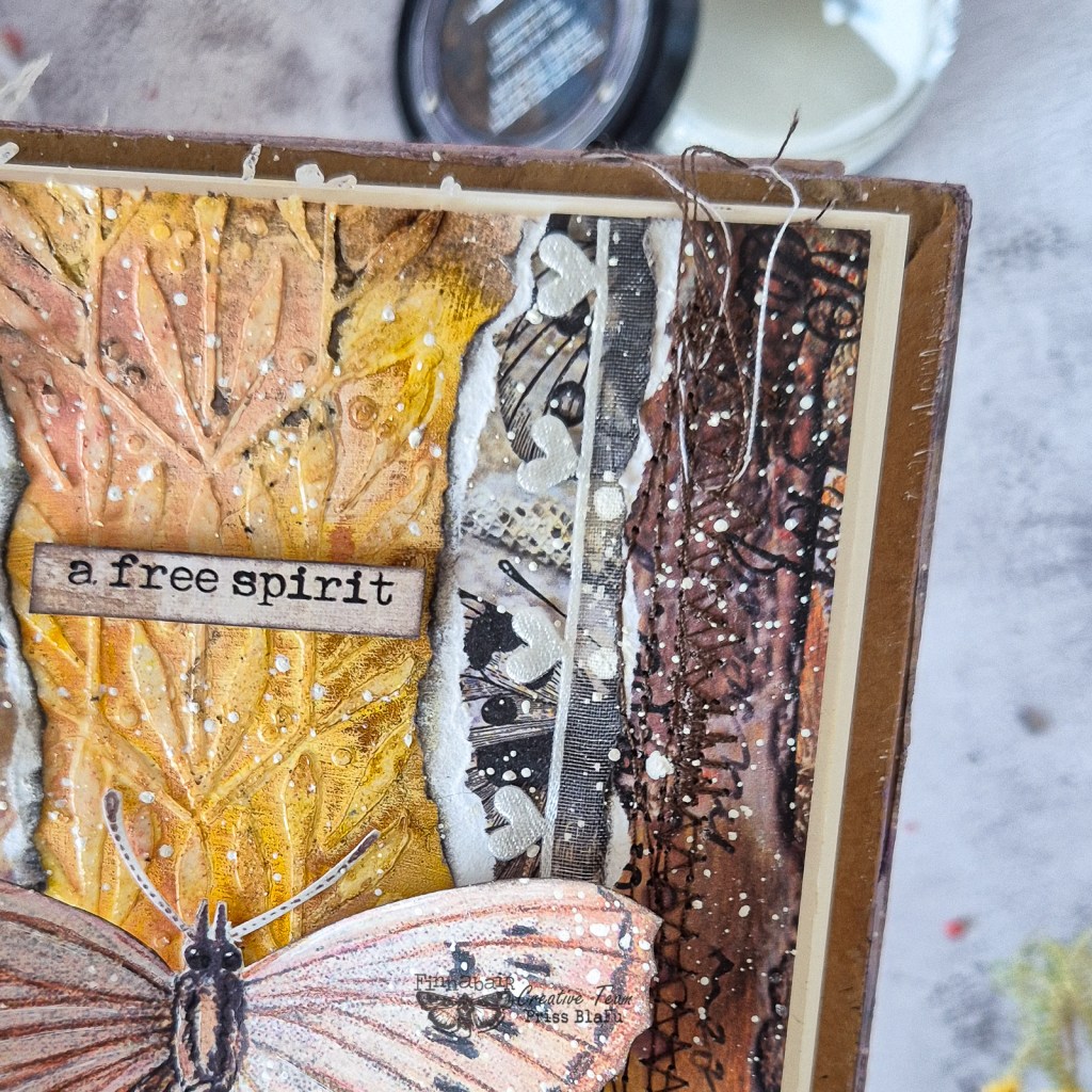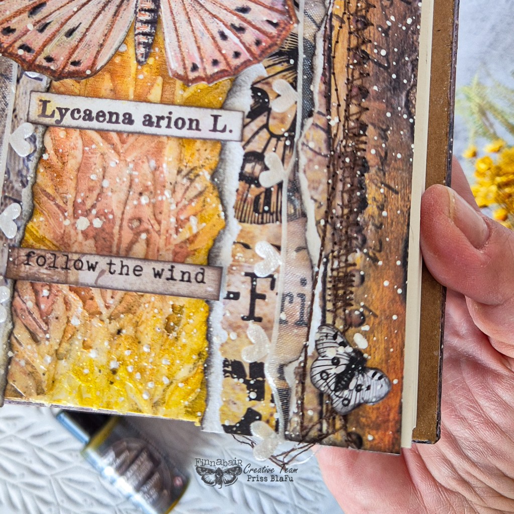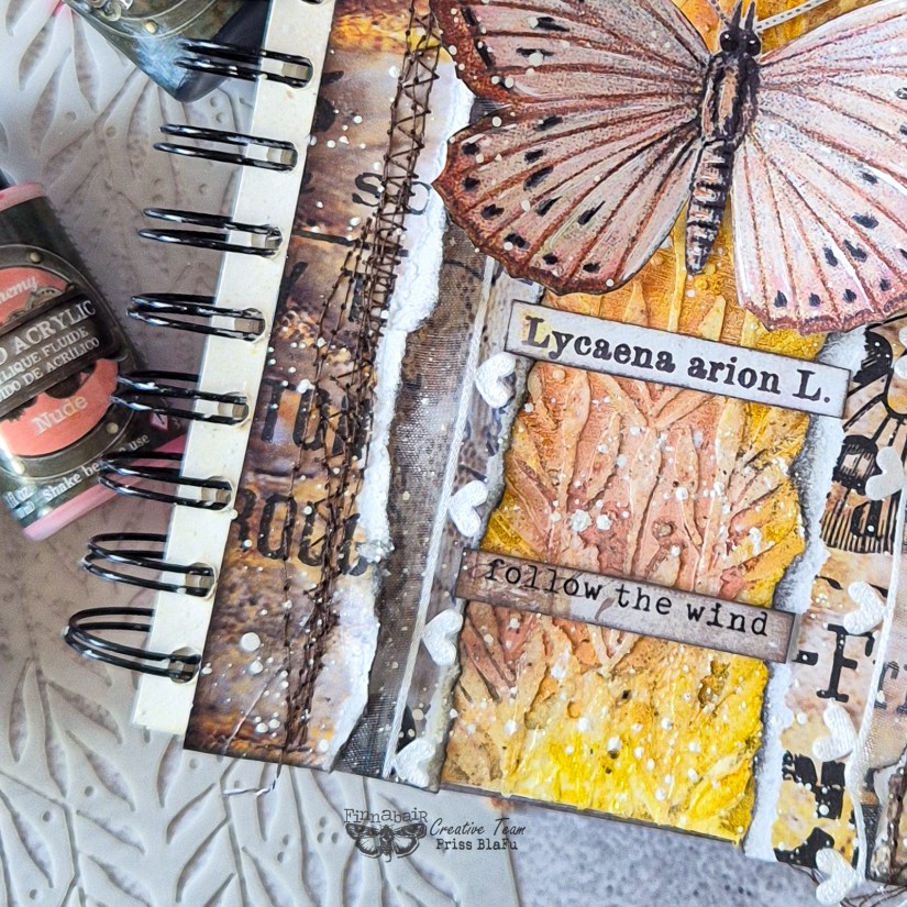 Usé tonos cálidos y delicados con los Liquid Acrylics. Además, utilicé papeles de la colección Butterfly Effect de Finnabair y 7 Dots Studio. Me encanta esta colección porque tiene unos colores que evocan esta temporada tan especial del otoño. Esta colección también se caracteriza por un estilo vintage muy delicado.